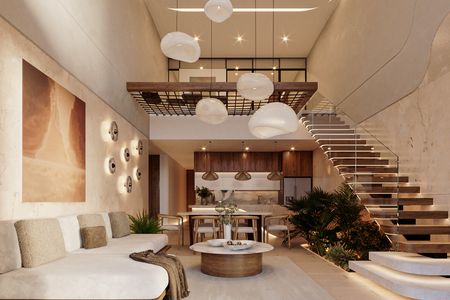 Sala de doble altura, comedor, sala de tv y medio baño.